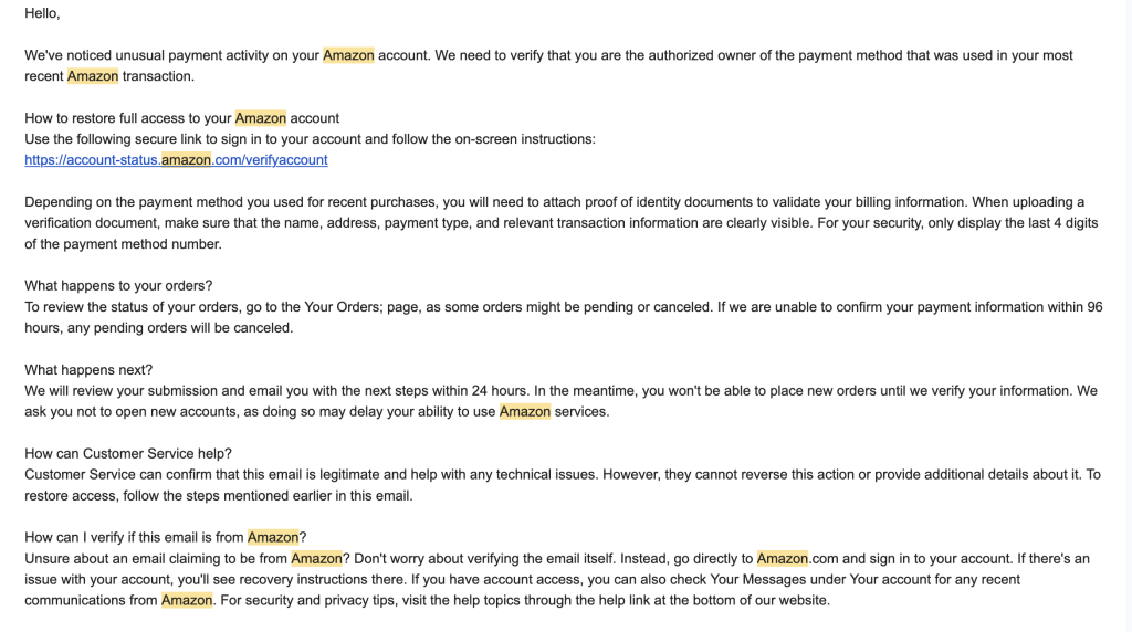 I placed a normal order. Instead of a smooth checkout experience, I received a message saying Amazon had noticed unusual payment activity and needed to verify that I was the authorized owner of the payment method used in the transaction.