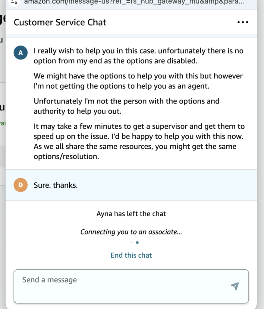 One support associate clearly said they wanted to help, but the options on their end were disabled. They indicated that they were not the person with the authority to resolve the issue and that even if escalation happened, I might still get the same options or the same resolution.