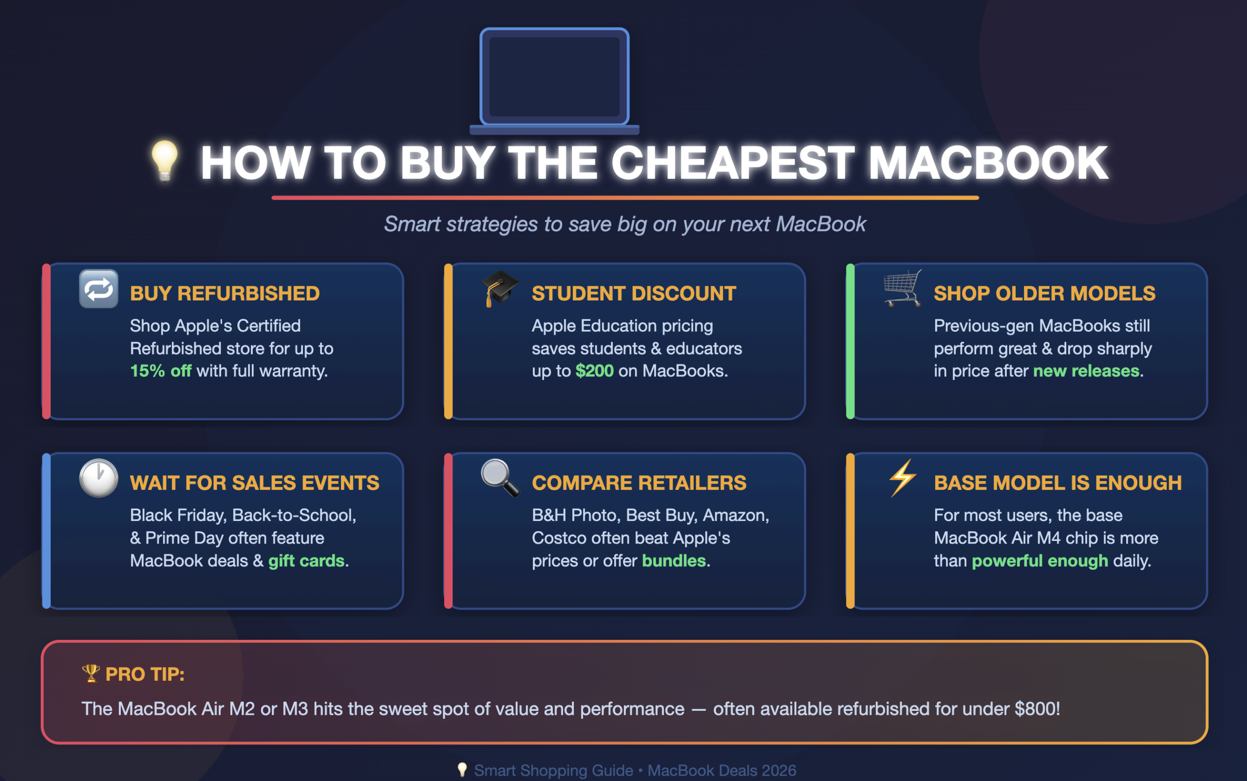 The key to getting the cheapest MacBook isn’t just one trick โ€” it’s stacking multiple savings together. Here’s the hierarchy: