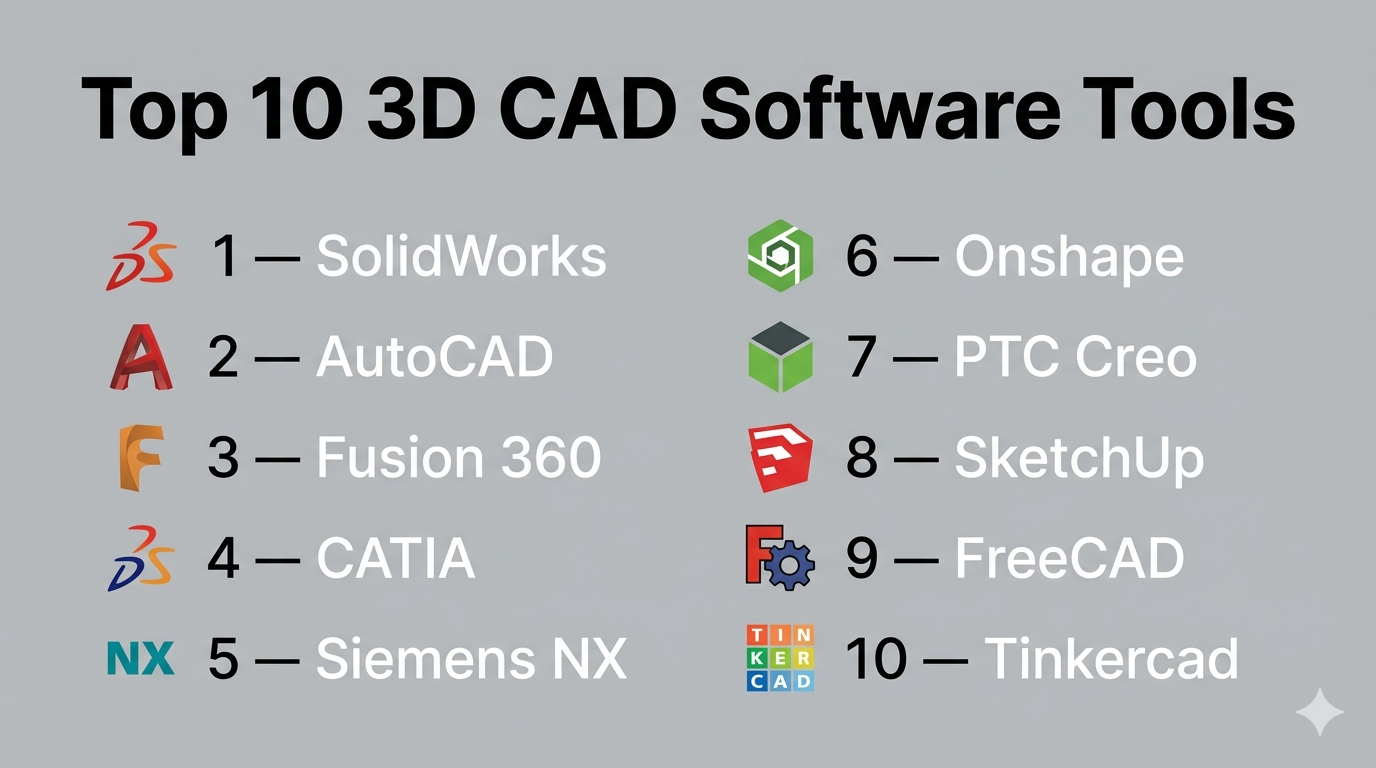 Top 10 3D CAD Software: Features, Pros, Cons & Comparison3D CAD (Computer-Aided Design) software enables users to create, modify, simulate, and optimize designs in a three-dimensional environment. These tools are essential across industries such as manufacturing, architecture, engineering, automotive, and product design, helping teams move from concept to production with precision.
