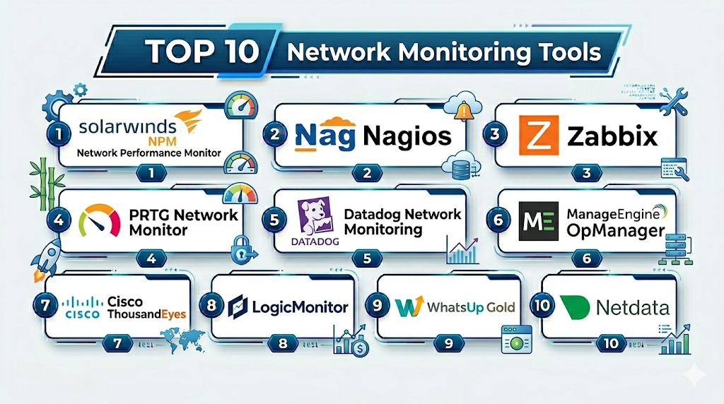 Network Monitoring Tools are platforms that help organizations track, analyze, and optimize the performance, availability, and health of their network infrastructure. These tools provide visibility into routers, switches, servers, firewalls, and network traffic, enabling teams to detect issues before they impact users.
