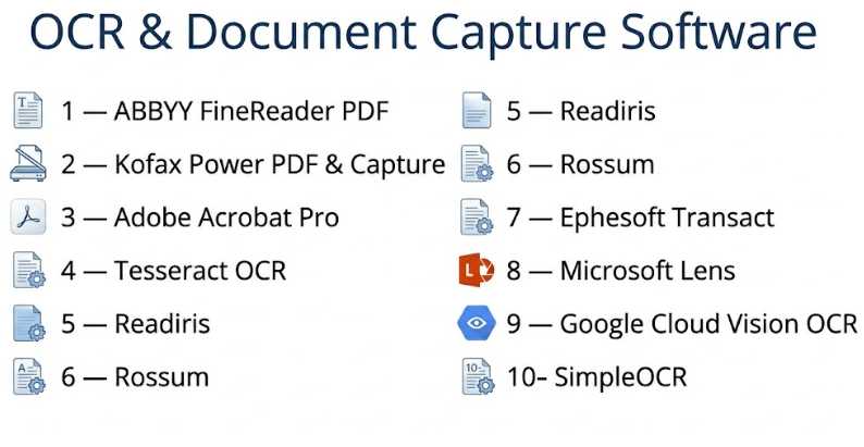 - Enterprise-grade focus: Kofax, Ephesoft, ABBYY
