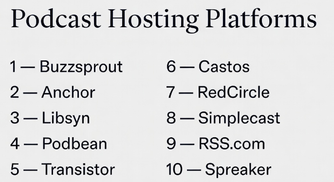 - Distribution to major directories (Spotify, Apple Podcasts, etc.)